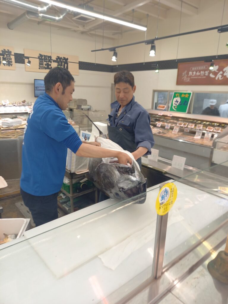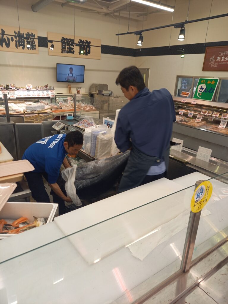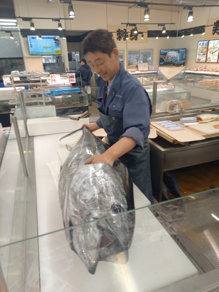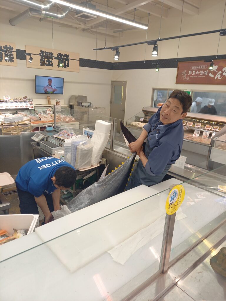 2026年04月24日 生の本マグロ・・解体前~ お知らせ 青果 鮮魚 今日の志来菜彩・・・ 広告初日です! 気合を入れて「のぼり旗」を 立てていきますよ 店内では 生産者さんが 新鮮な農産物や手作りスウィーツを 並べてくれてます お魚売り場では 運ばれてきました 「漢」たち2名で 台の上に引っ張り上げます 今日も巨大な 本マグロ!! 「生の」本マグロ!! 解体しちゃいます!! 迫力の解体ショーに お客様も大満足!! 週末も志来菜彩でおまちしてます!! 一覧へ戻る 前の記事へ 次の記事へ