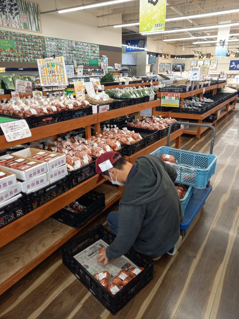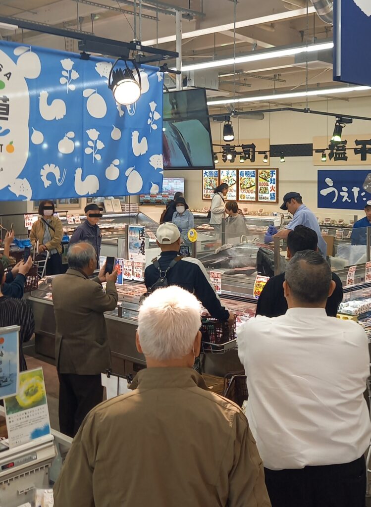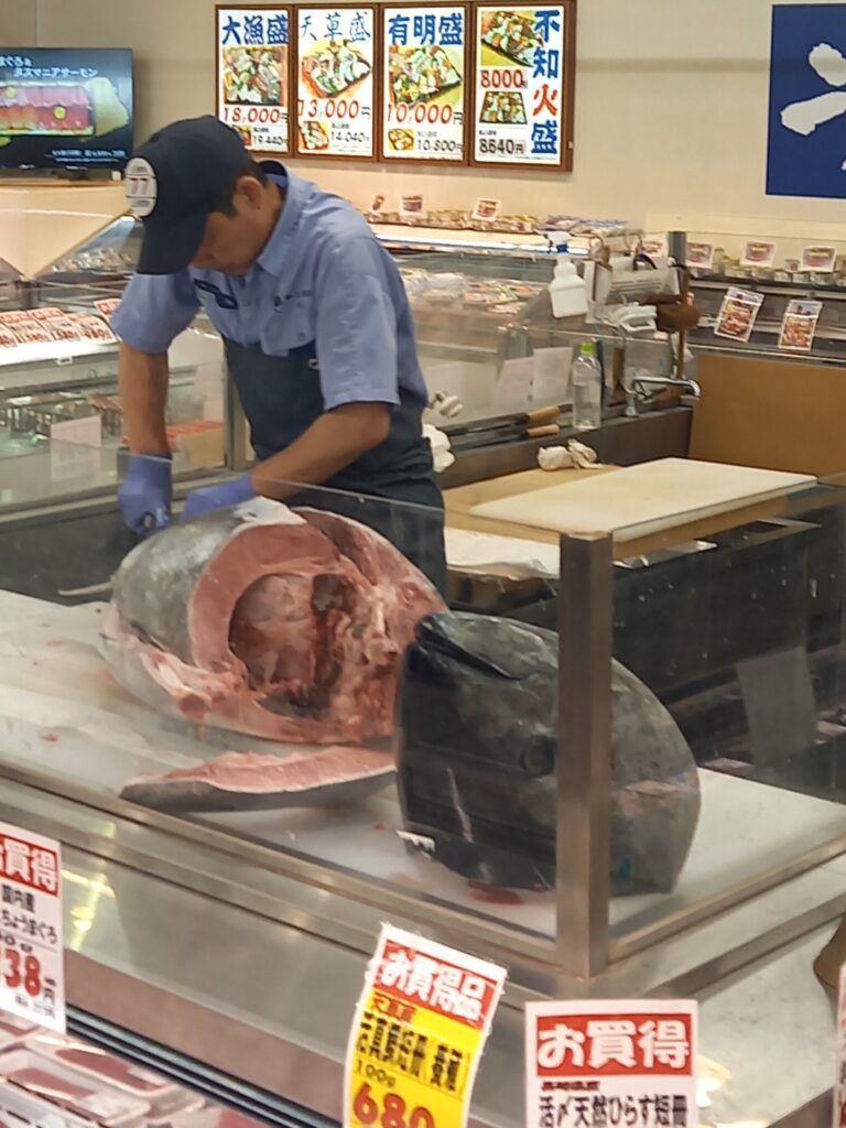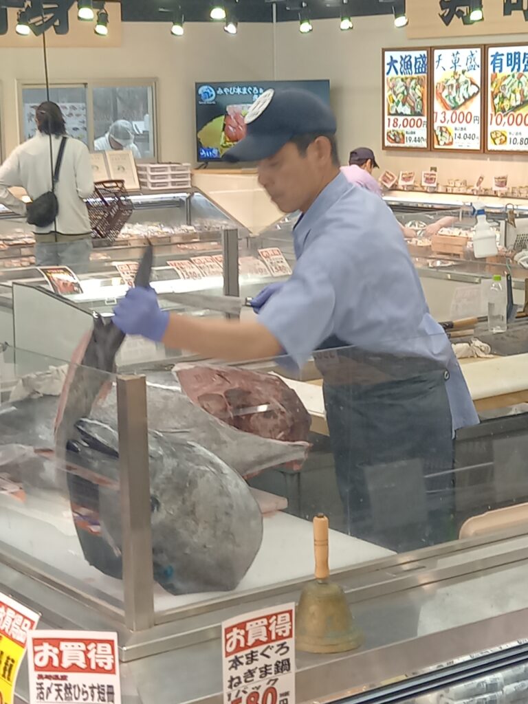 2026年04月24日 生の本マグロ・・解体前~ お知らせ 青果 鮮魚 今日の志来菜彩・・・ 広告初日です! 気合を入れて「のぼり旗」を 立てていきますよ 店内では 生産者さんが 新鮮な農産物や手作りスウィーツを 並べてくれてます お魚売り場では 運ばれてきました 「漢」たち2名で 台の上に引っ張り上げます 今日も巨大な 本マグロ!! 「生の」本マグロ!! 解体しちゃいます!! 迫力の解体ショーに お客様も大満足!! 週末も志来菜彩でおまちしてます!! 一覧へ戻る 前の記事へ 次の記事へ
